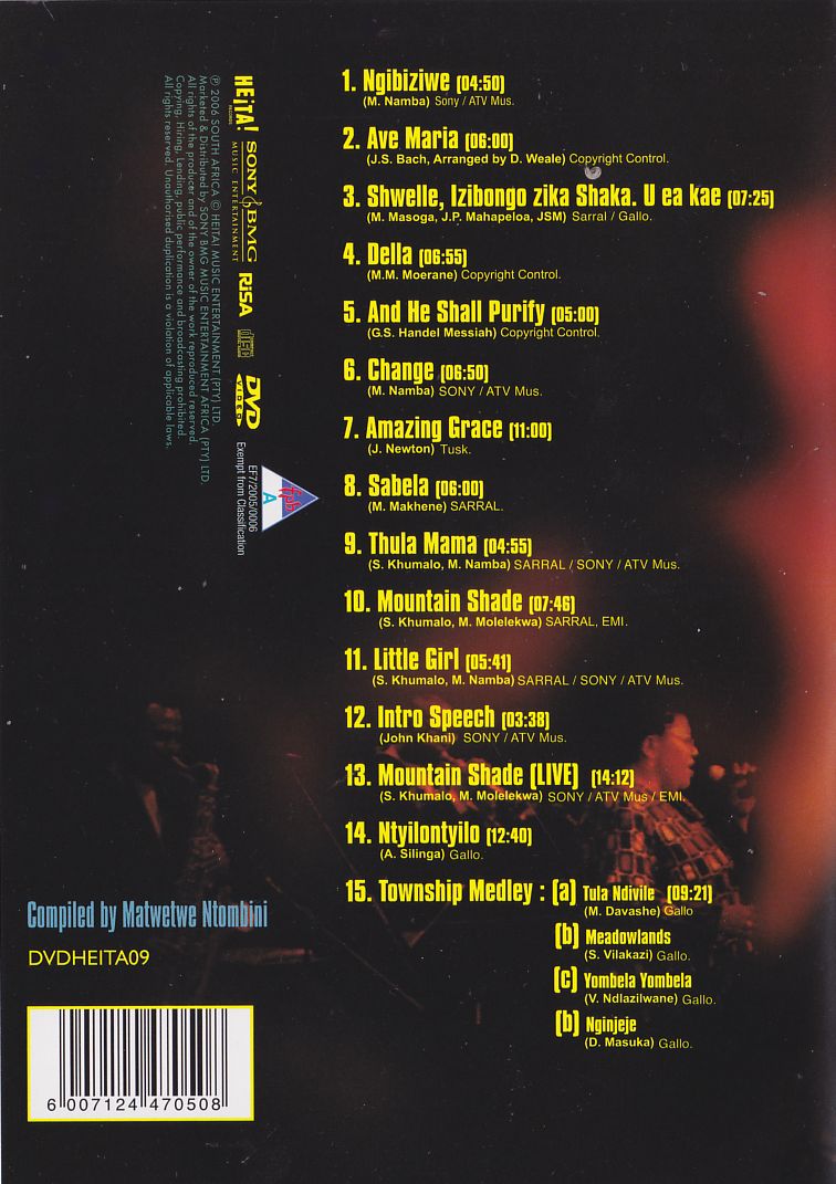 | Contents: | 1 Ngibiziwe 2 Ave Maria 3 Shwelle, Izibongo Zika Shaka U Ea Kae 4 Della 5 And He Shall Purify 6 Change 7 Amazing Grace 8 Sebela 9 Thula Mama 10 Mountain Shade 11 Little Girl 12 Intro Speech 13 Mountain Shade 14 Ntyilontyilo 15 Township Medley: Tula Ndivile / Meadowlands / Yombela Yombela / Nginjeje |